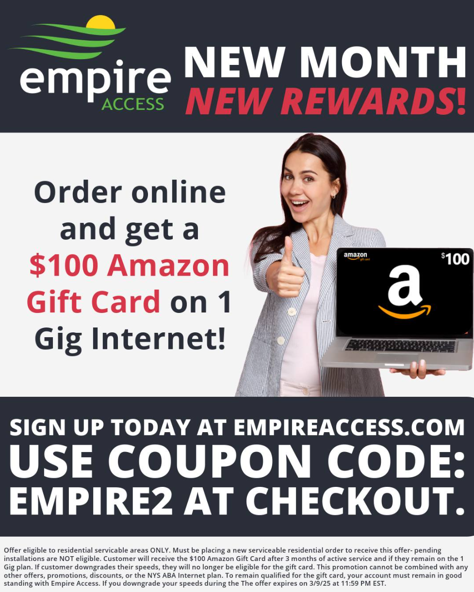 Don’t miss out on this limited-time offer! Enhance your internet experience with Empire Access and enjoy the added bonus of a $100 Amazon Gift Card. Whether you’re working from home, streaming your favorite shows, or gaming online, Empire Access has got you covered.