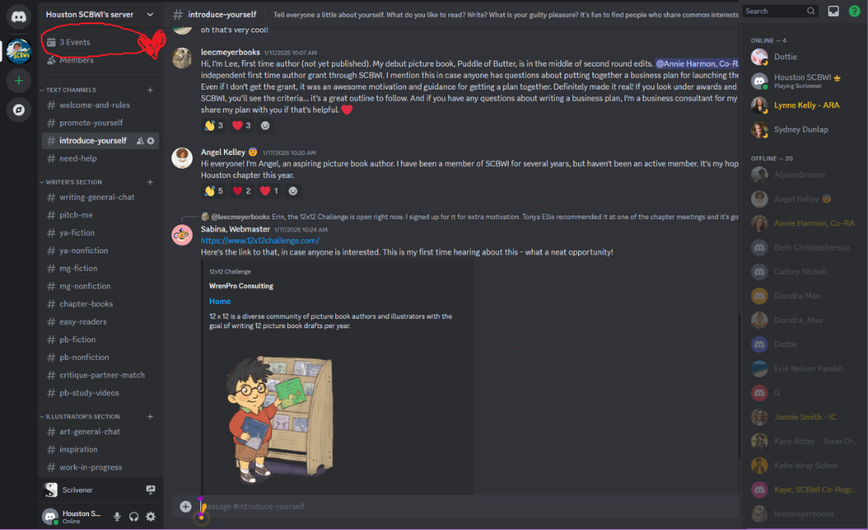Want to connect one-on-one? Check out the voice channels at the bottom of the list (with video and sharing capabilities like Zoom). Whether it’s for a critique session or just a chat, they’re available for all members to use—except for the Chapter Critique Group channel, which is reserved for chapter events.