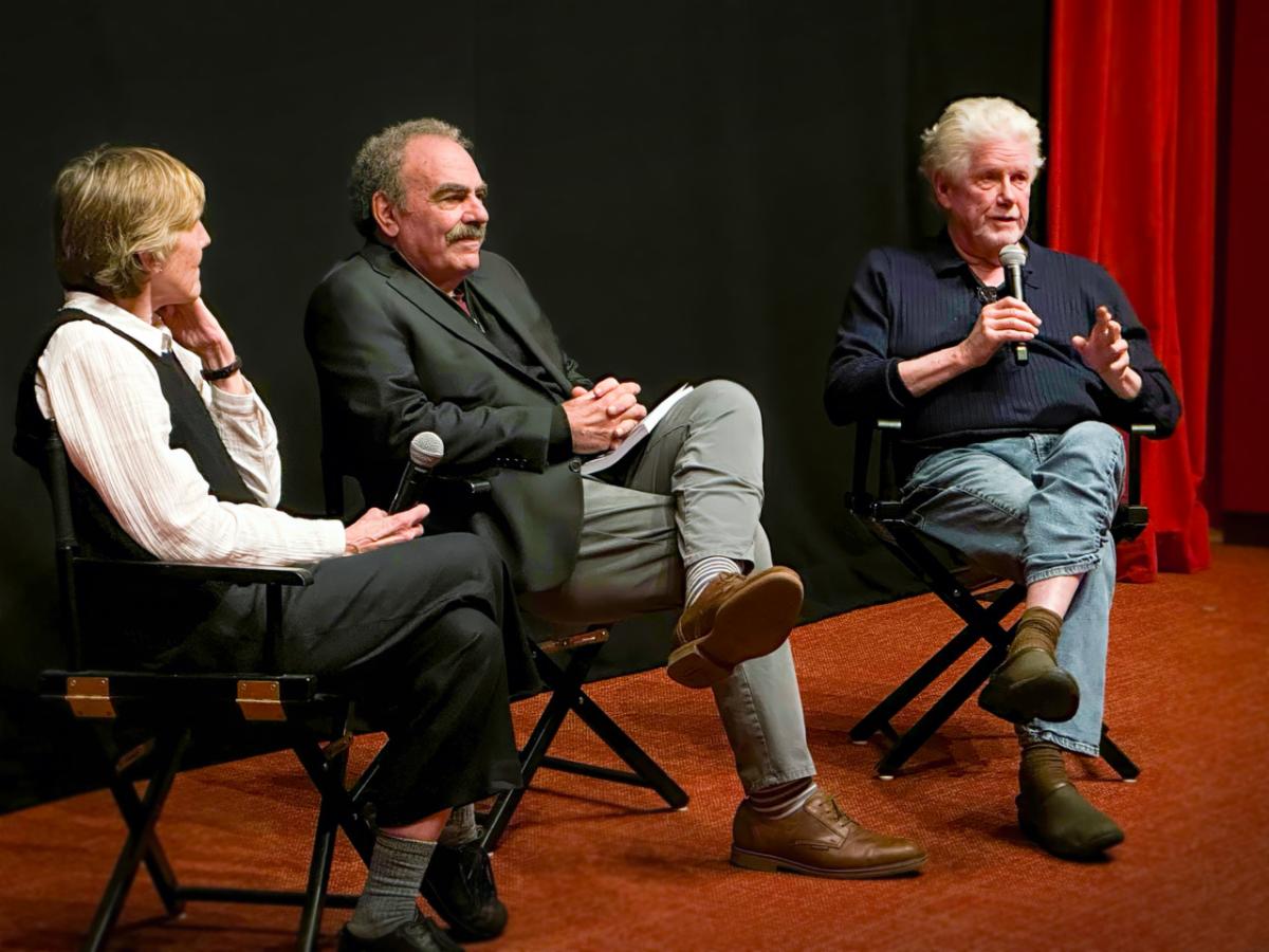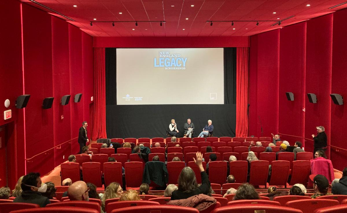 Are you a LEF grantee or fellow with news to share about your film? | | | | Image Descriptions: LEFT: Three figures with light skin sit in black chairs with microphones. RIGHT: A red cinema with the three seated figures at the front under a screen that says NEW ENGLAND LEGACY SCREENINGS. An audience member toward the back of the theater raises a hand. | | |