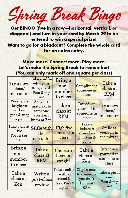 We have so many fun things happening this month! From themed classes that will keep you smiling (and maybe singing along) to special pop-ups designed to shake up your routine, March is all about keeping movement playful and motivation high. If winter has had you feeling a little stuck, this is your sign to switch it up. Try a new format, a different instructor, or a class time you’ve never taken before. Growth happens when we step just outside our comfort zone. Speaking of which…March 21–29, we’re bringing a little sunshine into the studio with Spring Break Bingo! It’s the perfect excuse to try something new, bring a friend, and build momentum heading into spring.