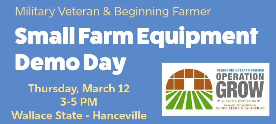 Thurs, Mar 12, 3-5pm, Military Vet. & Begin Farmer - Equipment Demo Day. This event will feature equipment available for rent to small farmers through the Operation Grow HELP program. Attendance to the training qualifies participants to rent equipment. This event will be held at Wallace State Community College. Free class but registration required.