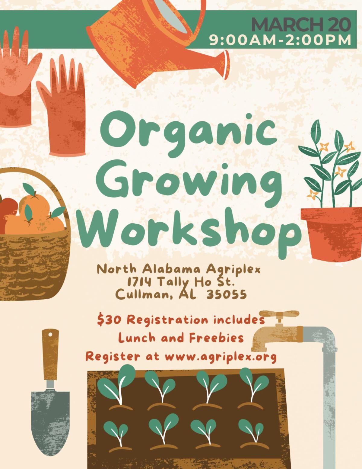 Fri, Mar 20, 9am-2pm, Living Landscapes - Organic Growing Workshop. This organic growing workshop focuses on building a thriving garden ecosystem using natural, sustainable methods. Participants will learn how to enhance soil health, implement effective natural weed and pest control, and use organic fertilization techniques for abundant, nutrient-dense harvests. Hands-on; Lunch provided.Youth ages 12-15 are welcome and must register and be accompanied with a paid, registered adult. $30 per person.