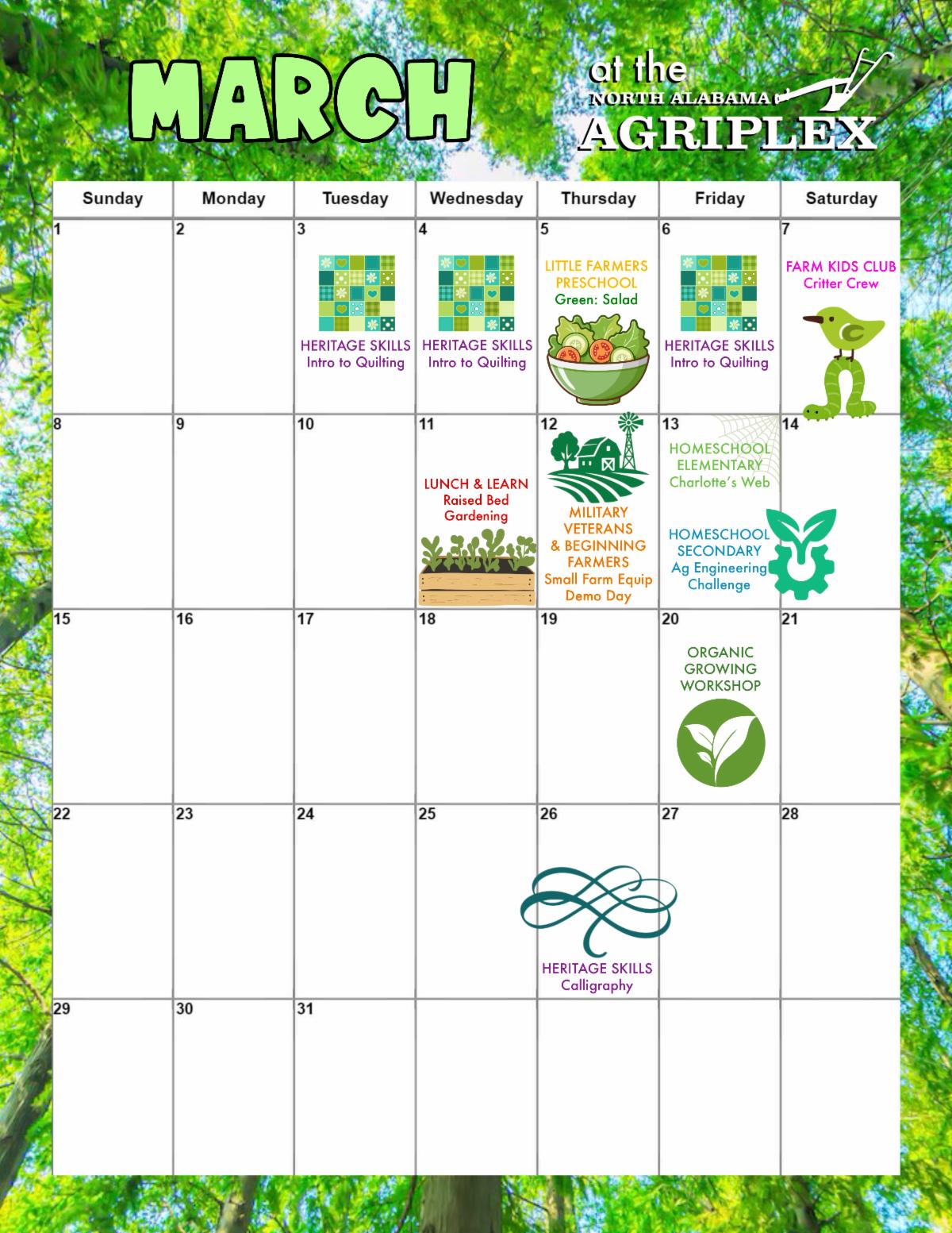Wed, Mar 11, 12pm, Lunch & Learn - Raised Bed Gardening. Rachel will share the secrets to successful raised beds and containers, how to get started, and what to grow for success. See the Agriplex raised beds for inspiration. Registration includes light lunch, $10 fee. Youth ages 12-15 are welcome and must register and be accompanied with a paid, registered adult.