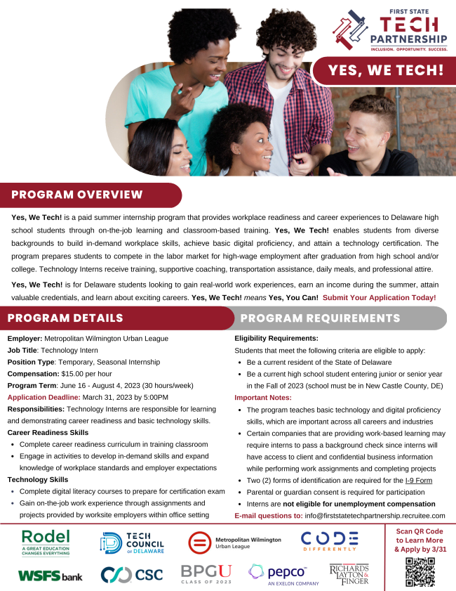 Yes, We Tech! It is a paid summer internship program that provides workplace readiness and career experiences to Delaware high school students through on-the-job learning and classroom-based training.