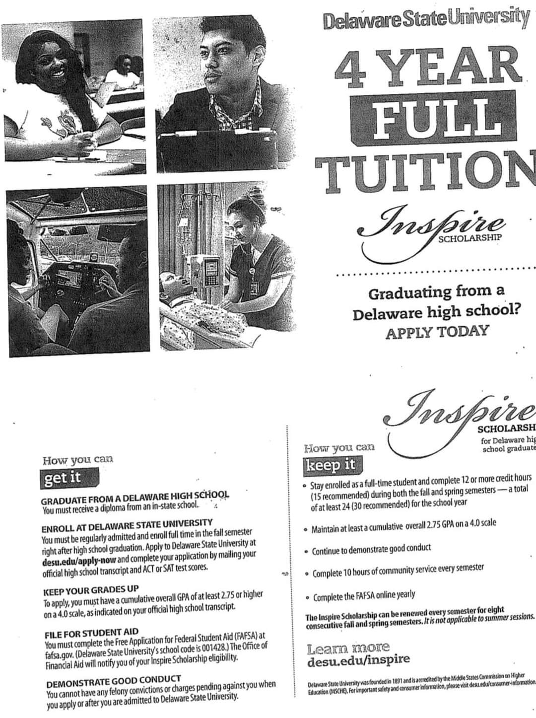 - Be admitted to an accredited Delaware college in a two- or four-year degree program at the undergraduate level