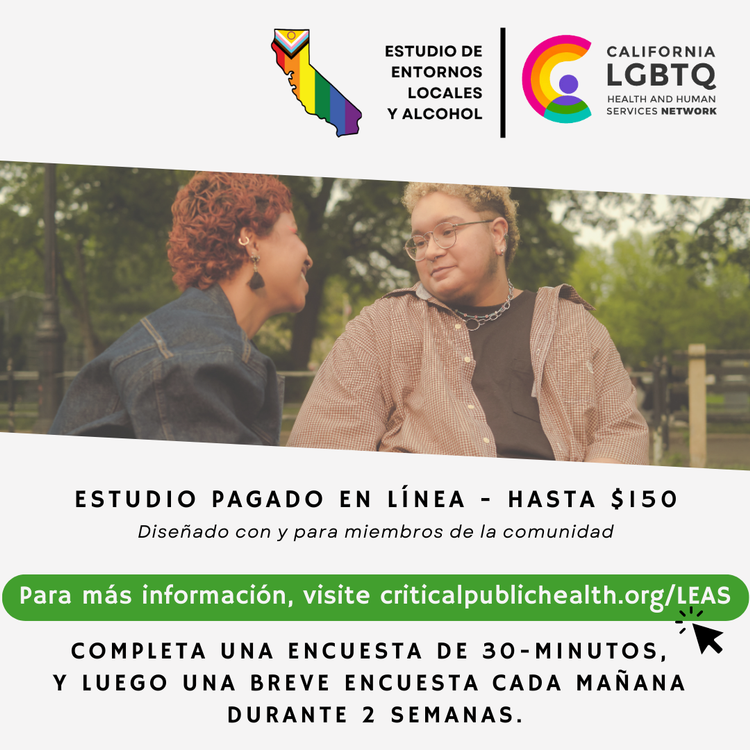Invitamos a jóvenes adultos que viven en California a participar en un estudio de investigación que explora cómo las condiciones estructurales —como las políticas, el acceso a los recursos y las experiencias de estigma dentro de diferentes comunidades— influyen en el consumo de alcohol y otras drogas. Al comprender mejor estas experiencias, este estudio busca orientar futuras intervenciones, incluyendo posibles cambios a nivel de políticas y sistemas que mejoren el acceso a la atención y promuevan la salud comunitaria.