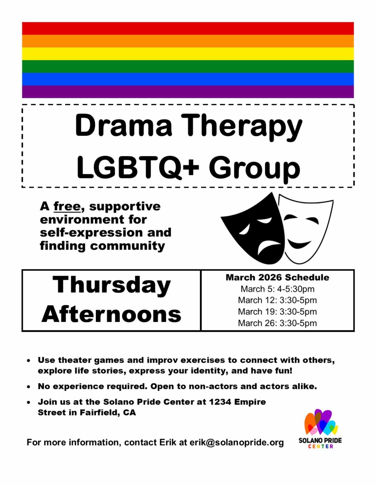 Starting at a new time continuing Thursday, March 5th, 2025 from 4 to 5:30 pm in the Conference Room! Then, Thursdays from 3:40 to 5 pm the rest of March! LGBTQ+ Drama Therapy Group