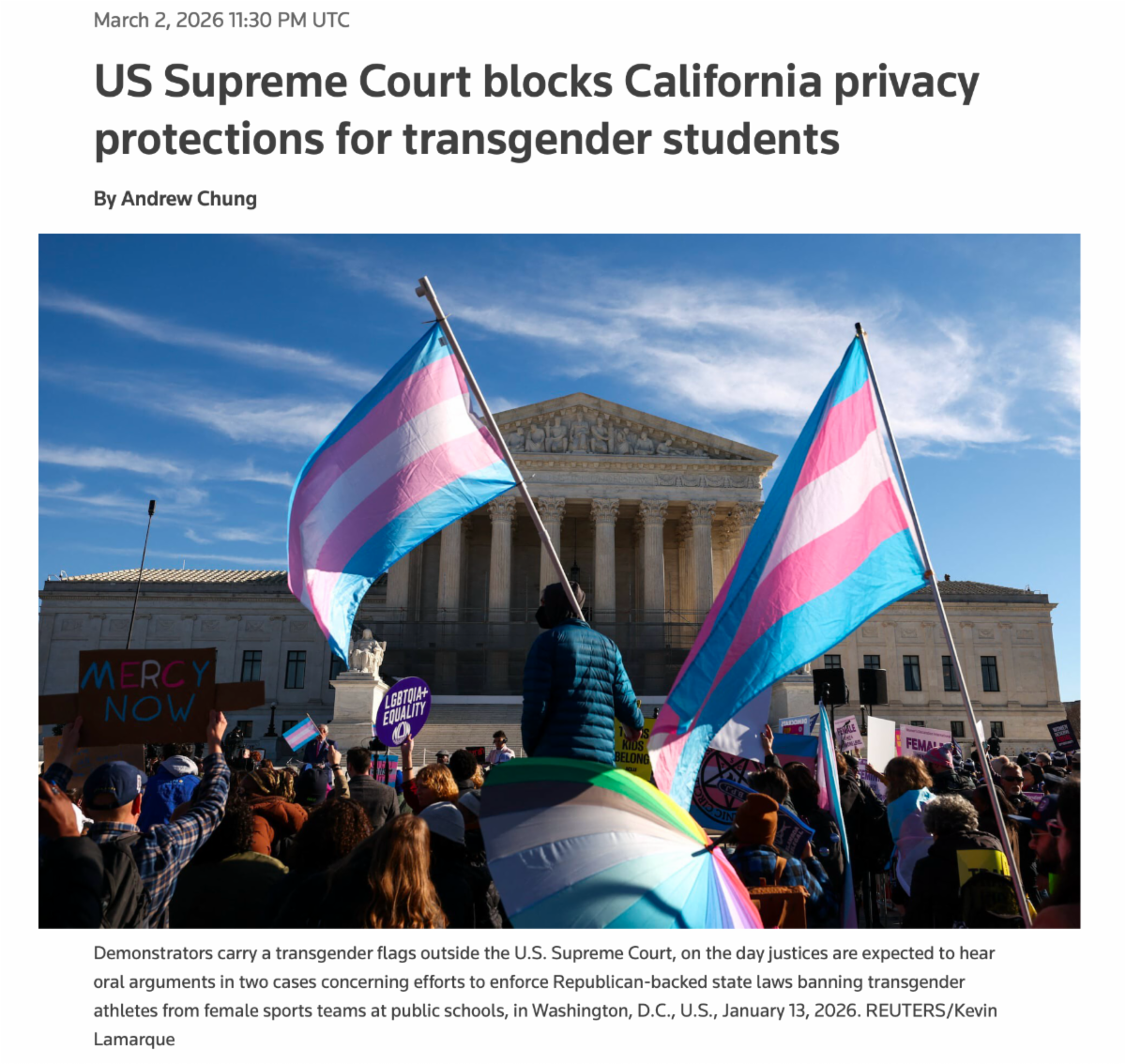 “Today’s decision by the U.S. Supreme Court to intervene in this case is deeply disturbing. By stepping in on an emergency basis, the Court has effectively upended California’s student privacy protections without hearing full arguments and before the judicial process has run its course. While not surprising, this move reflects a dangerous willingness to short-circuit the established judicial process to dismantle protections for transgender youth.