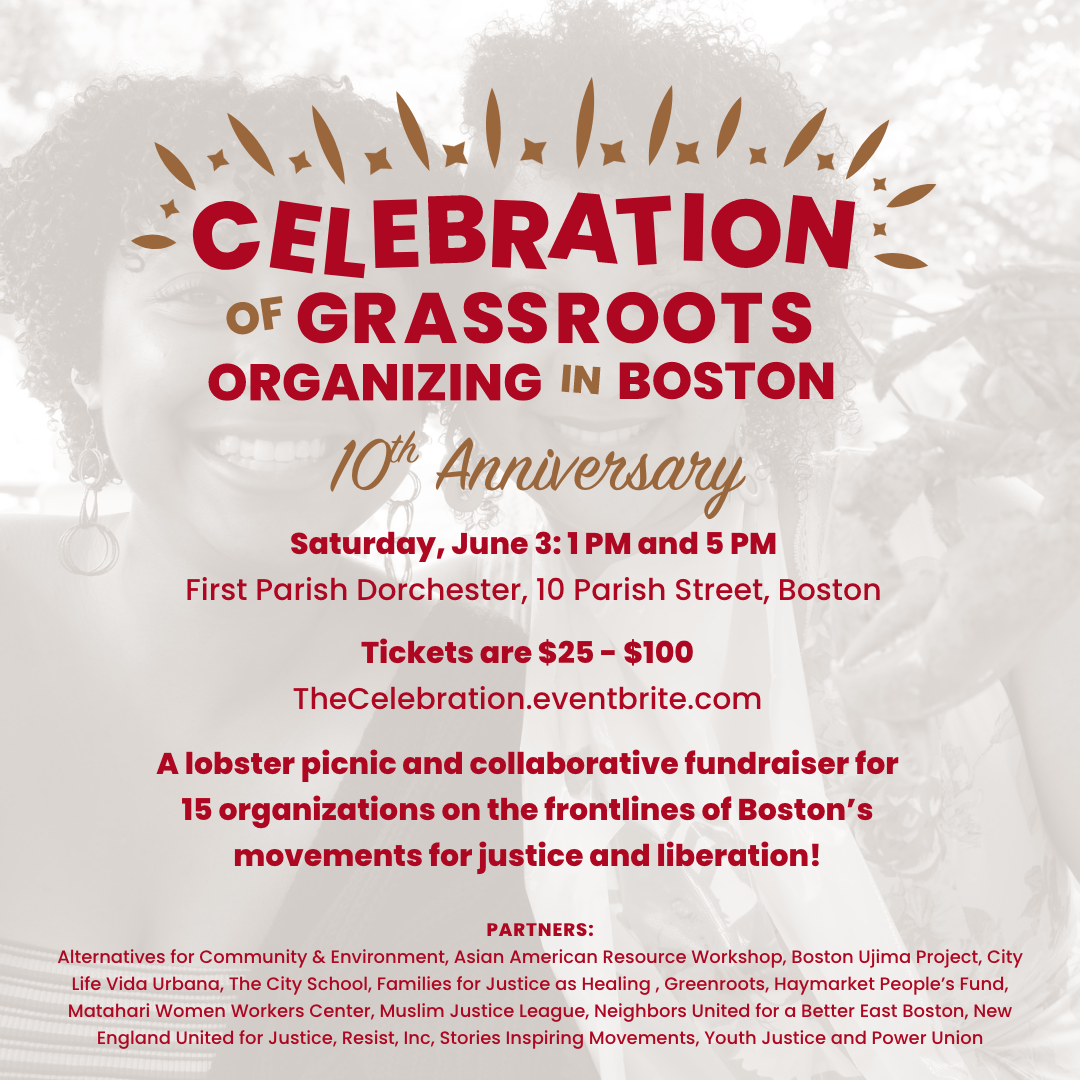 The Celebration of Grassroots Organizing (formerly known as the Lobster Feed) is entering its 10th year! Boston Women's Fund is sponsoring this year’s 10th Anniversary Celebration of Grassroots Organizing, a lobster picnic (with delicious vegan and kosher options) raising money for 15 organizations on the front lines of Boston’s movements for justice and liberation.