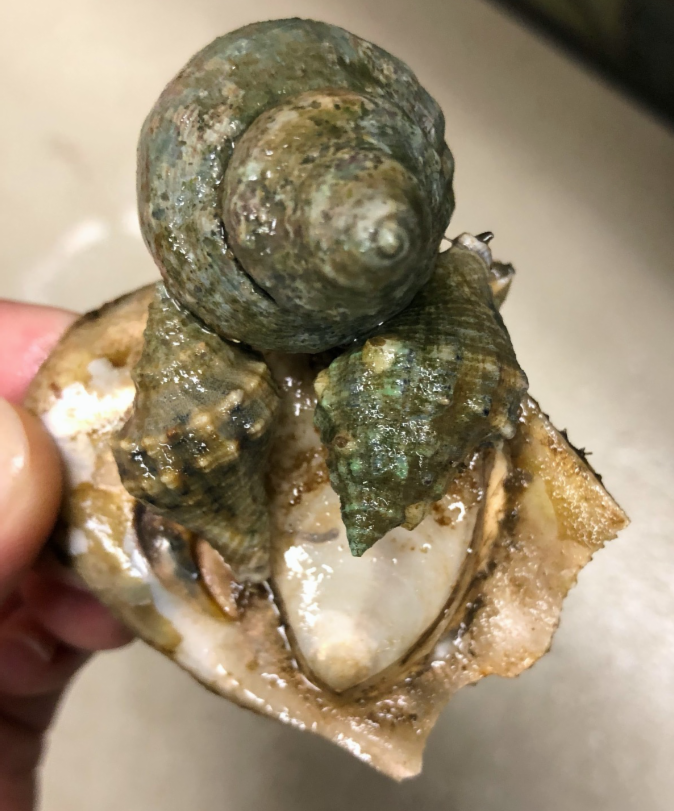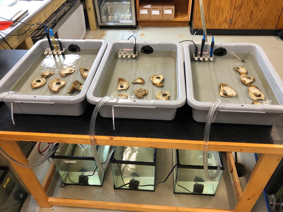 Dr. Andy Shantz and graduate student Donaven Baughman have been examining the effect of salinity on juvenile oysters. Results show that spat survival is significantly lower in high salinity contexts. In addition, oysters exposed to chemical cues from predatory oyster drills showed evidence of increasing shell thickness, possibly as a defense mechanism.