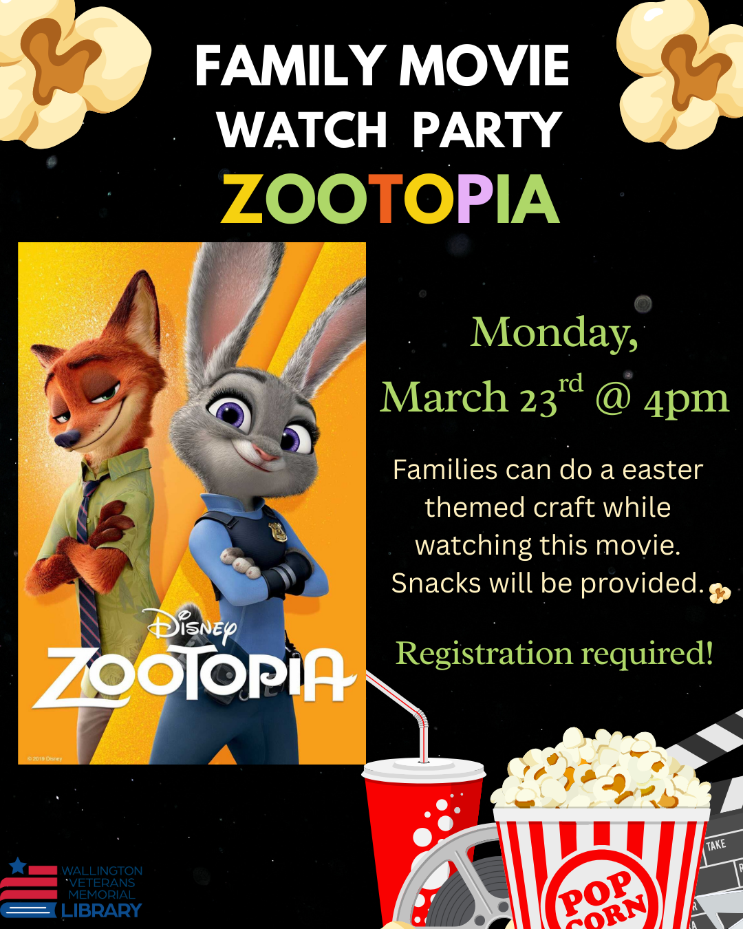 Families can join this watch party to make a simple Easter craft and watch the all-time favorite movie Zootopia. Snacks will be provided