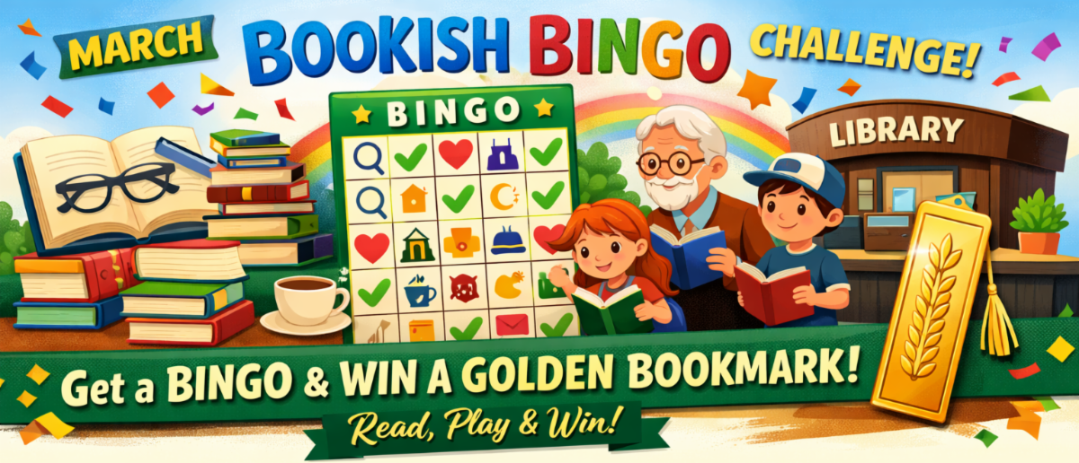 Readers of all ages are invited to participate. Stop by the front desk to pick up your Bingo sheet, then start reading to complete the prompts on the card. Once you complete a row (horizontal, vertical, or diagonal), bring your sheet back to the front desk to claim your golden bookmark prize!