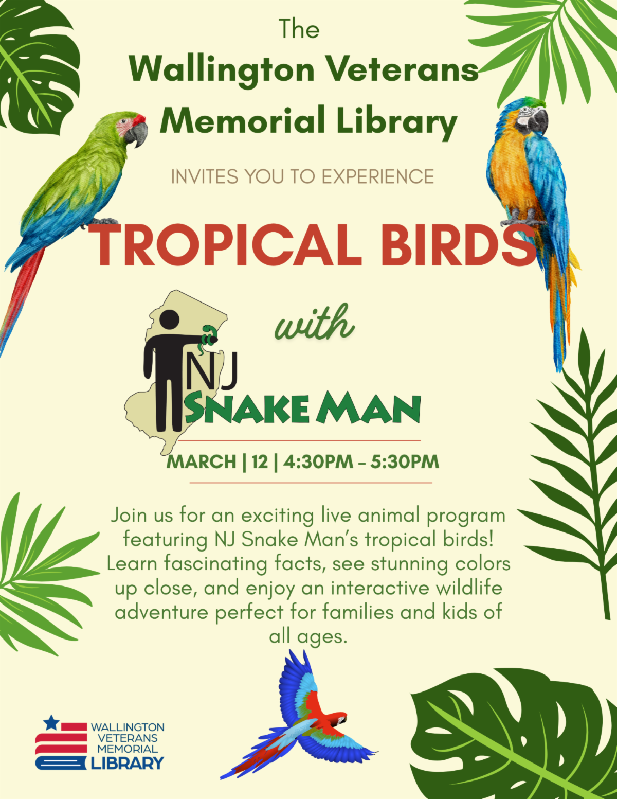 Families can join this event to see different types of Tropical birds presented by NJ Snake Man Parties.