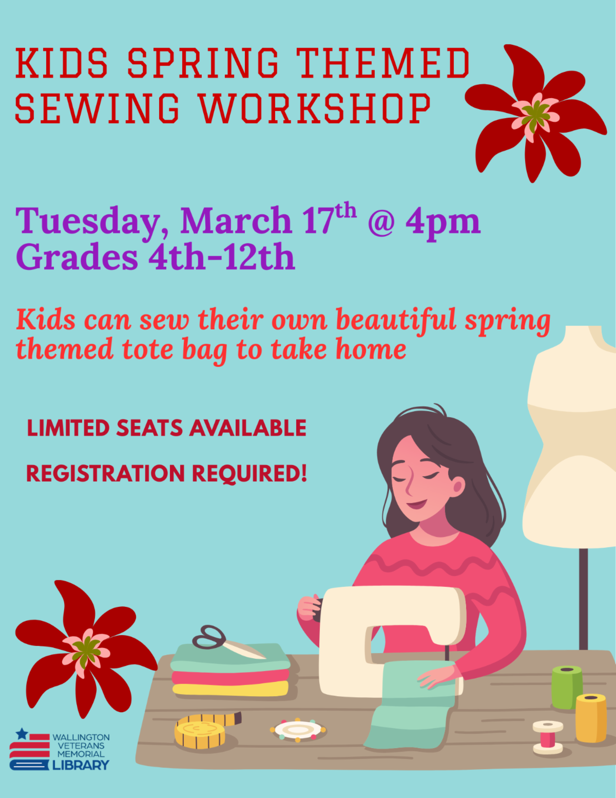 Kids between grades 4th - 12th can join this workshop to sew their own Spring themed tote bags with Ms.Ellen to take home.