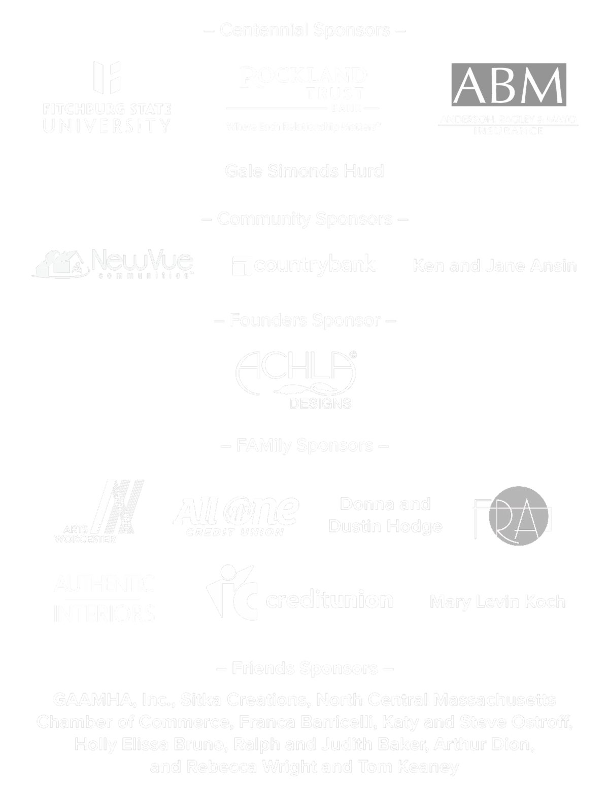 | | Generous Support for Eleanor's Dream: A 100th Birthday Soirée is provided by our sponsors. Centennial Sponsors: Fitchburg State University, Rockland Trust, Gale Simonds Hurd, and Anderson, Bagley & Mayo Insurance. Community Sponsors: NewVue Communities, Ken and Jane Ansin, and Country Bank. Founders Sponsor: Achla Designs. FAMily Sponsors: ArtsWorcester, All One Credit Union, Donna and Dustin Hodge, Authentic Interiors, Mary Levin Koch, and the Fitchburg Redevelopment Authority. Friends Sponsors: GAAMHA, Inc., Sitka Creations, North Central Massachusetts Chamber of Commerce, IC Credit Union, Franca Barricelli, Katy and Steve Ostroff, Holly Elissa Bruno, Ralph and Judith Baker, Arthur Dion, and Rebecca Wright and Tom Keaney | | Kaleidoscope: 100 Years of Collecting for Our Community | |