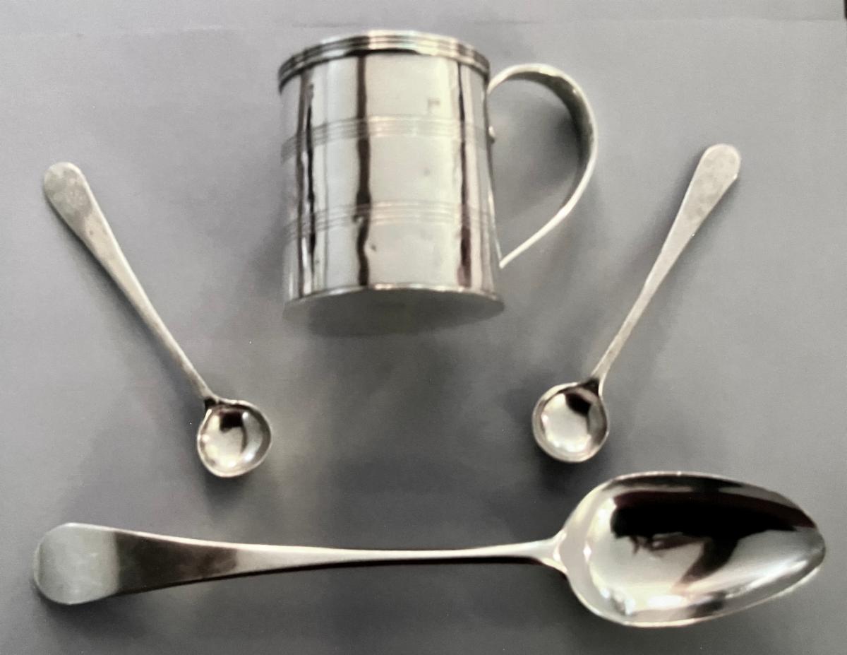 The story of Elizabeth’s life can be pieced together from evidence in Woodlawn’s archives and collections as well from her descendants. For example, this silver baby’s cup, owned privately, was purchased in Boston from Jones, Ball & Low company. It was a gift to her from her father. The cup is shown alongside silver spoons from the Woodlawn collection that