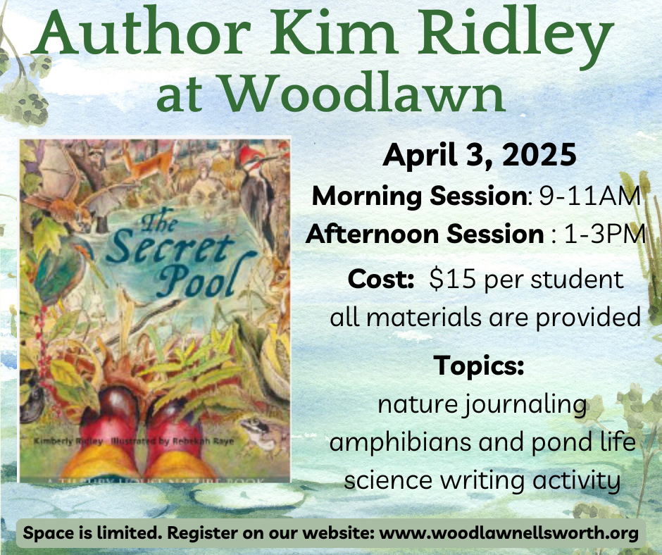 Learn about the amphibians and plant life that call the Woodlawn pond home. The session will include creating a nature journal, a science writing activity, and a visit the pond to look for amphibians.