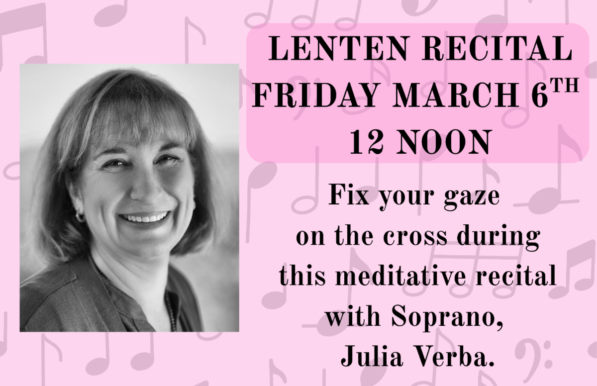 Coming up next Friday, March 6th at 12:00pm we will have a Lenten Recital with Soprano Julia Verba. She will be singing songs that follow Holy Week events through Good Friday including "The Call" by Ralph Vaughn Williams, "The Crucifixion" by Samuel Barber, and "Pie Jesu" by Andrew Lloyd Weber. You can also expect piano meditations and duets. It will be a meaningful 45 minutes of music to help us focus on the journey of our Lord and our relationship with Him. The optional charity donation opportunity for this recital will be Presbyterian Disaster Relief.