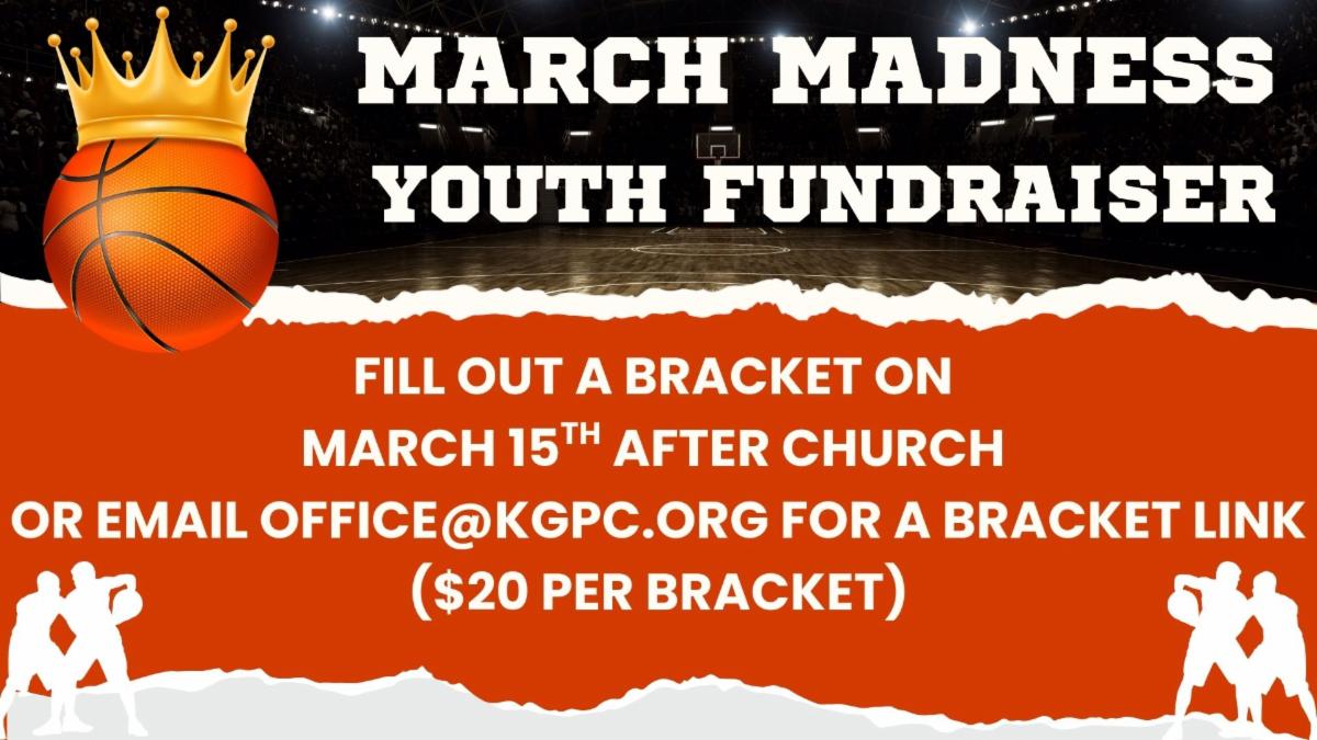 The Grow Ministry Team as well as the KGPC Youth want to offer you all a HUGE THANK YOU for your support of our camp and conference fundraisers over the past month. Between the Valentine’s Day Parent’s Night Out and the Shrove Tuesday Pancake Supper, over $1200 was raised for the youth faith formation fund. We are SO grateful for your support. Our goal is to reach $3,000 by the beginning of summer, and there will be several more ways for you to help us get there including our next fundraiser, a March Madness bracket challenge. For $20 you can enter a bracket into a friendly competition with other KGPC friends and family to potentially win the golden basketball trophy and a full year’s worth of bragging rights! Mark your interest on the Connect Card or stop by the March Madness table after service on March 15th, selection Sunday, to get your bracket set up and help us get closer to our $3000 fundraising goal!