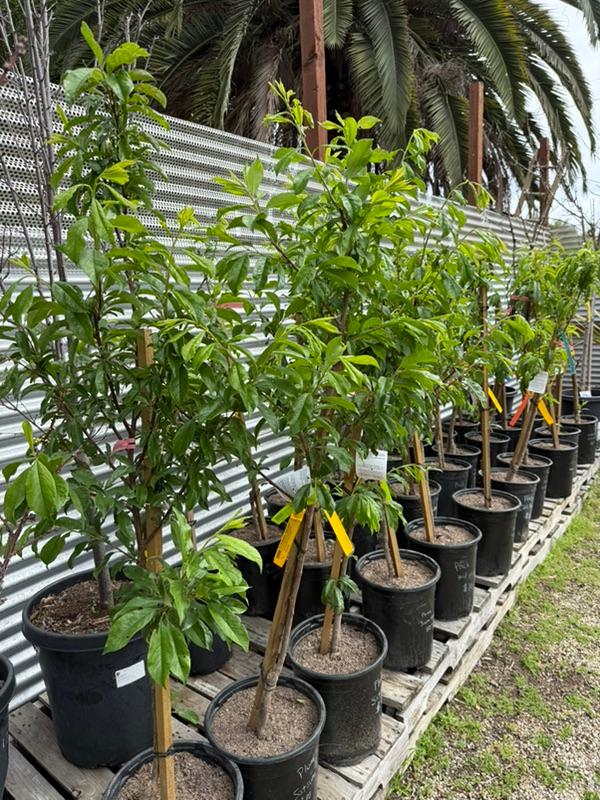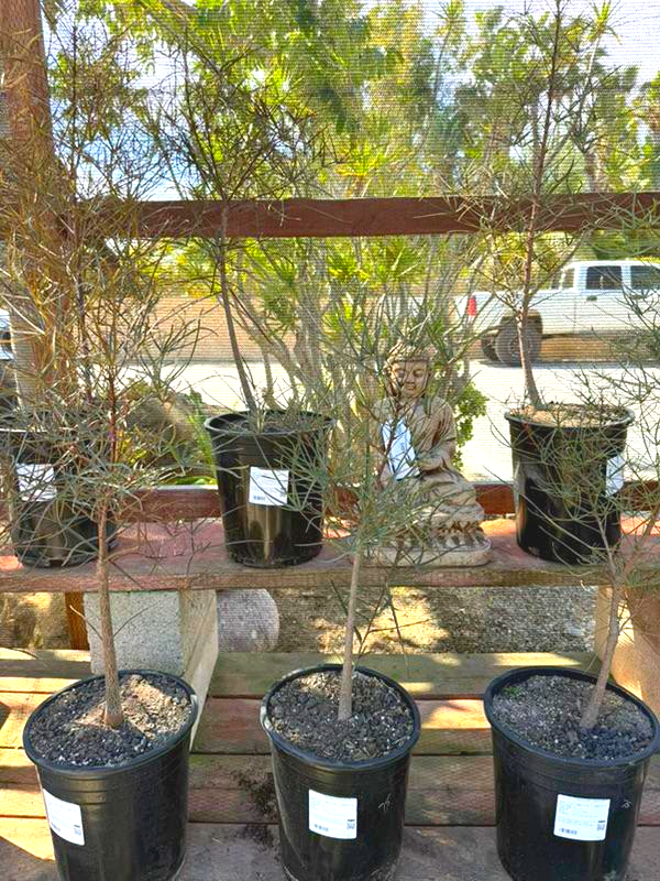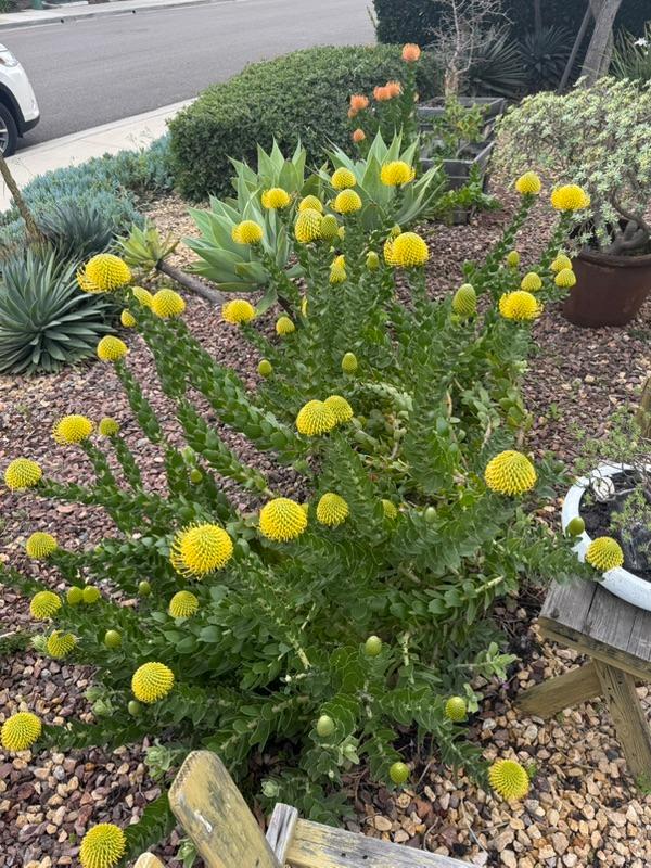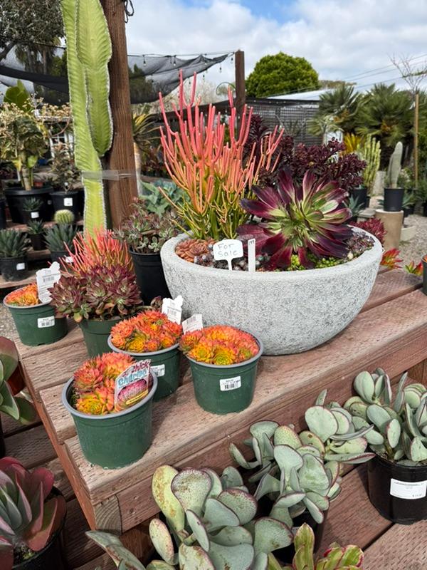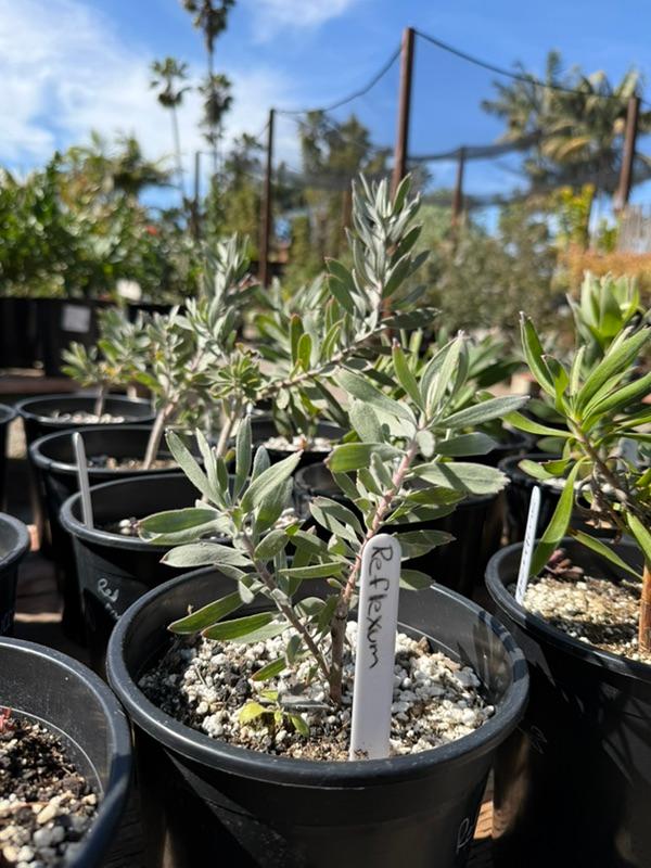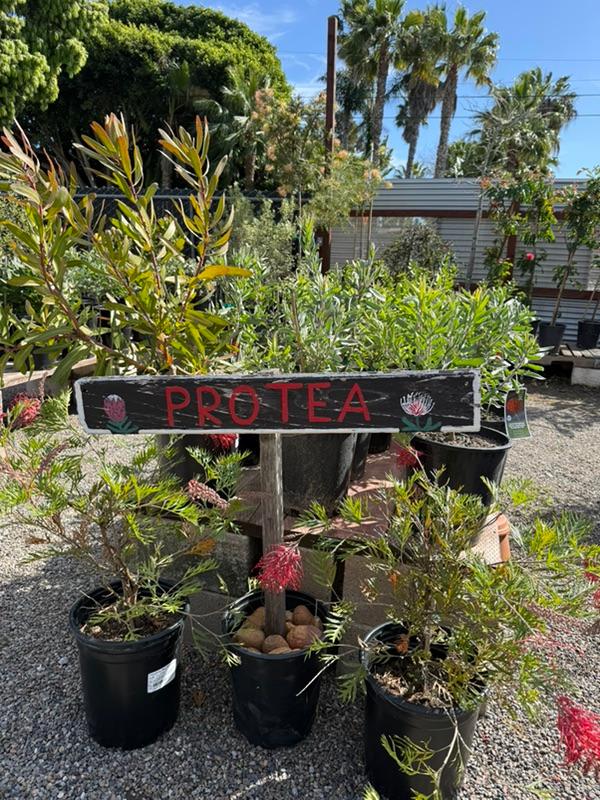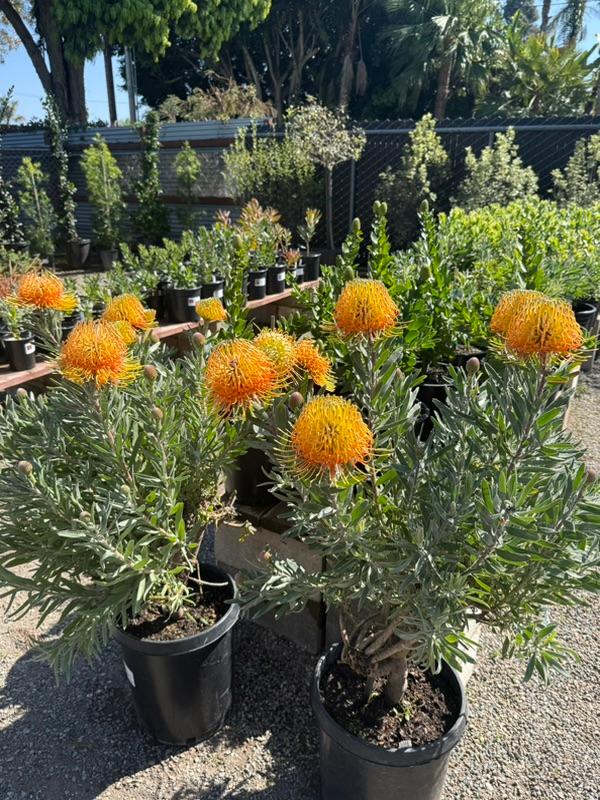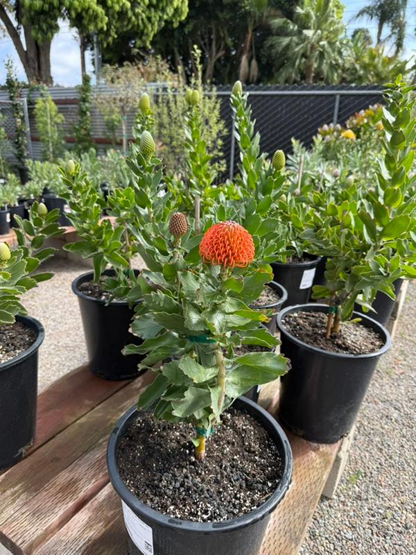 In March, we carry the largest selection of Proteaceae family plants, especially Leucospermum. We have an excellent selection of one-, two-, and five-gallon sizes. These plants are increasingly popular for their colorful, unique flowers that last for months. Varieties include Flame Giant, Brandi de la Cruz (Hawaiian hybrids with stunning flowers, orangey blooms in pics below), High Gold (best for first-timers, one of the easiest to grow, third pic below with 50+ blooms), Blanche Ito, and many others.