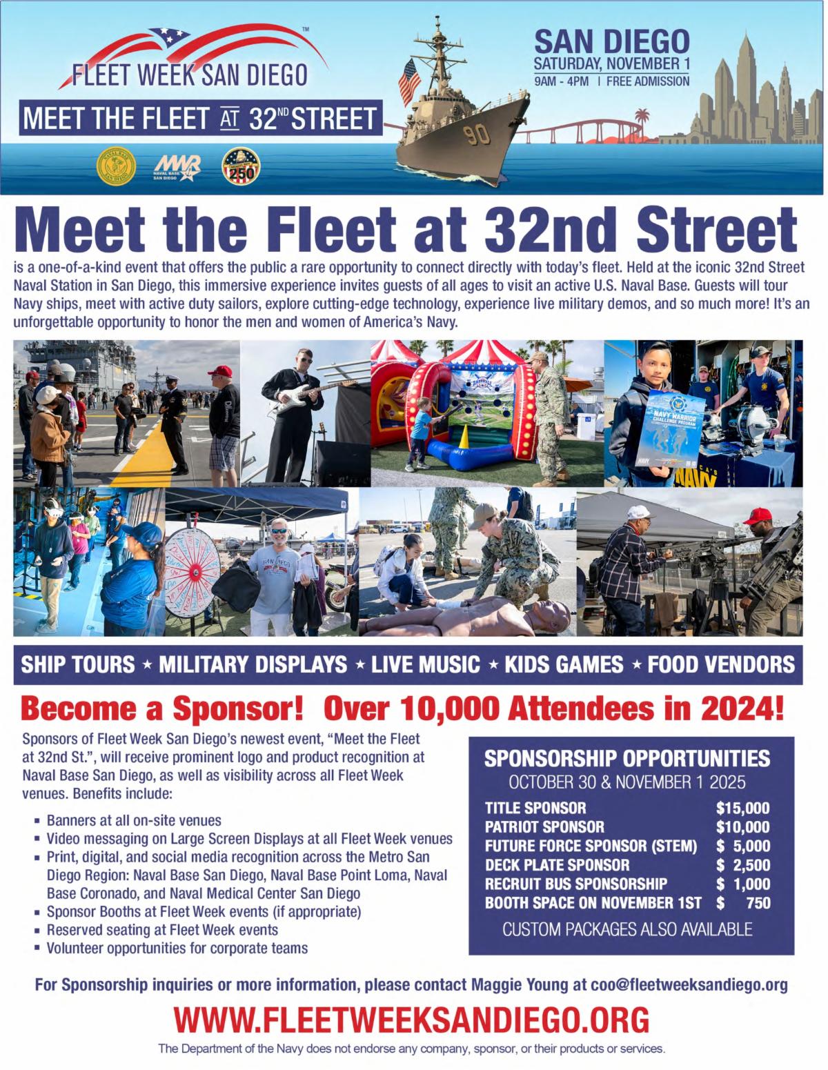 Interested in sponsoring? Packages start at just $750! Contact: Maggie Young – coo@fleetweeksandiego.org