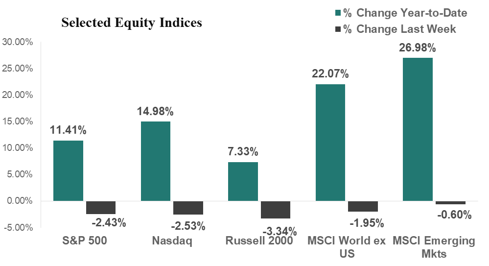 After touching all-time highs, US Equity Markets sold off following an escalation of trade and tariff rhetoric between the US and China and as the government shutdown continues. The S&P 500 declined 2.4% for the week and is now up 11.4% for the year. The Nasdaq fell 2.5% for the week to bring its gains for the year to 15.0%, while the Russell 2000 (small cap stocks) was down 3.3% for the week and is now up 7.3% for the year.