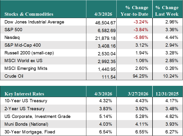 Global Equity Markets also increased last week on rising hopes for an opening of the Strait of Hormuz. Developed Markets rose 2.8% for the week and are now up 1.1% for the year. Emerging Markets were up 0.3% for the week to bring its gains for the year to 2.6%.