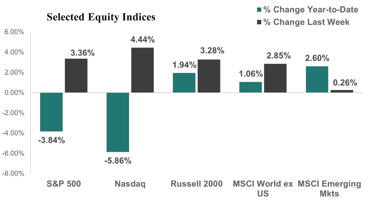 US Equity Markets rebounded last week on hopes for a de-escalation of tensions in the conflict with Iran. The S&P 500 rallied 3.3% for the week and is now down 3.8% for the year. The Nasdaq surged 4.4% for the week to bring its losses for the year to down 5.9%, while the Russell 2000 (small cap stocks) rose 3.3% for the week and is now up 1.9% for the year.