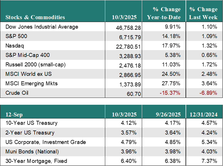 US Equity Markets increased last week despite the US Government shutdown and a lack of government-provided economic data. The S&P 500 rose 1.1% for the week and is now up 14.2% for the year. The Nasdaq was up 1.3% for the week to bring its gains for the year to 18.0%, while the Russell 2000 (small cap stocks) increased 1.7% for the week and is now up 11.0% for the year.