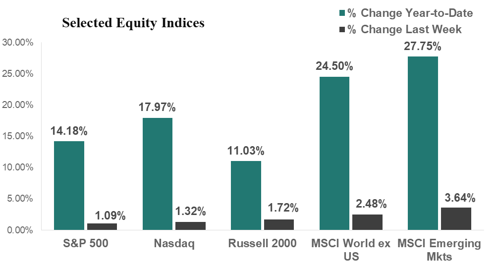 Global Equity Markets rose sharply last week with several European and Asian indices hitting all-time highs as investors hope for lower rates and fiscal stimulus. Developed Markets surged 2.5% for the week and are now up 24.5% for the year. Emerging Markets rallied 3.5% for the week to bring its gains for the year to 27.8%.