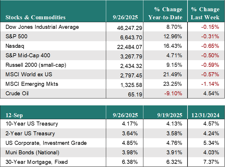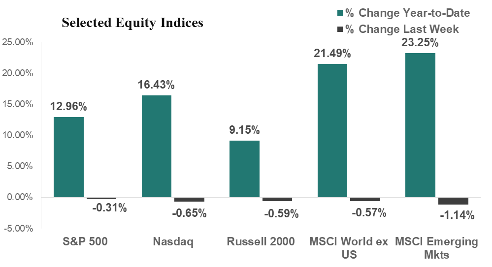 Global Equity Markets dropped last week, as more tariff announcements from President Trump impacted markets. Developed Markets declined 0.6% for the week and are now up 21.5% for the year. Emerging Markets fell 1.1% for the week to bring its gains for the year to 23.3%.