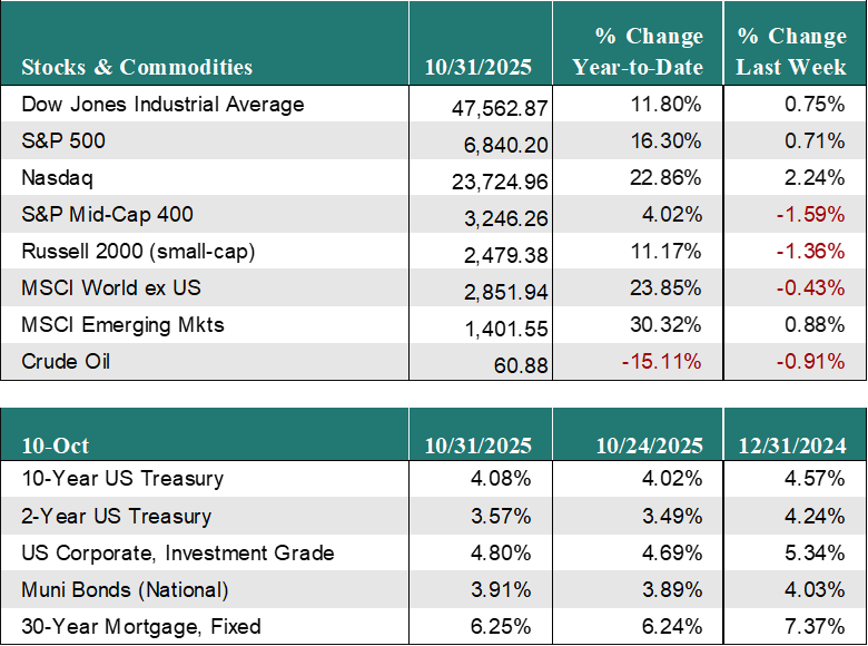 US Equity Markets were mixed last week, as progress on US-China trade was offset by concerns that the Fed may not lower rates as much as markets had been expecting. The S&P 500 increased 0.7% for the week and is now up 16.3% for the year. The Nasdaq was up 2.2% for the week on strong technology earnings reports to bring its gains for the year to 22.9%, while the Russell 2000 (small cap stocks) fell 1.4% for the week on higher rates and is now up 11.2% for the year.