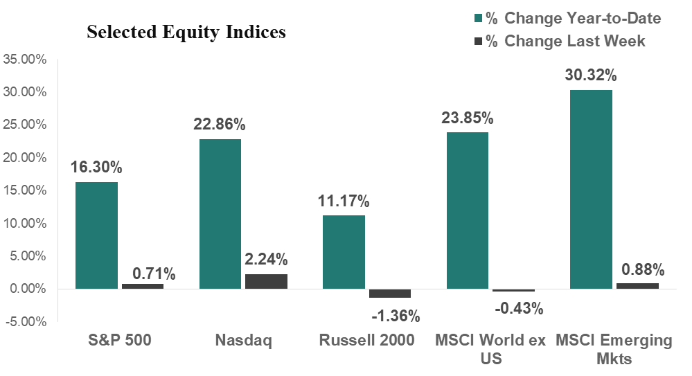 Global Equity Markets were also mixed last week, as the truce between the US and China boosted Asian equities while mixed economic data pressured European stocks. Developed Markets dropped 0.4% for the week and are now up 23.9% for the year. Emerging Markets rose 0.9% for the week to bring its gains for the year to 30.3%.