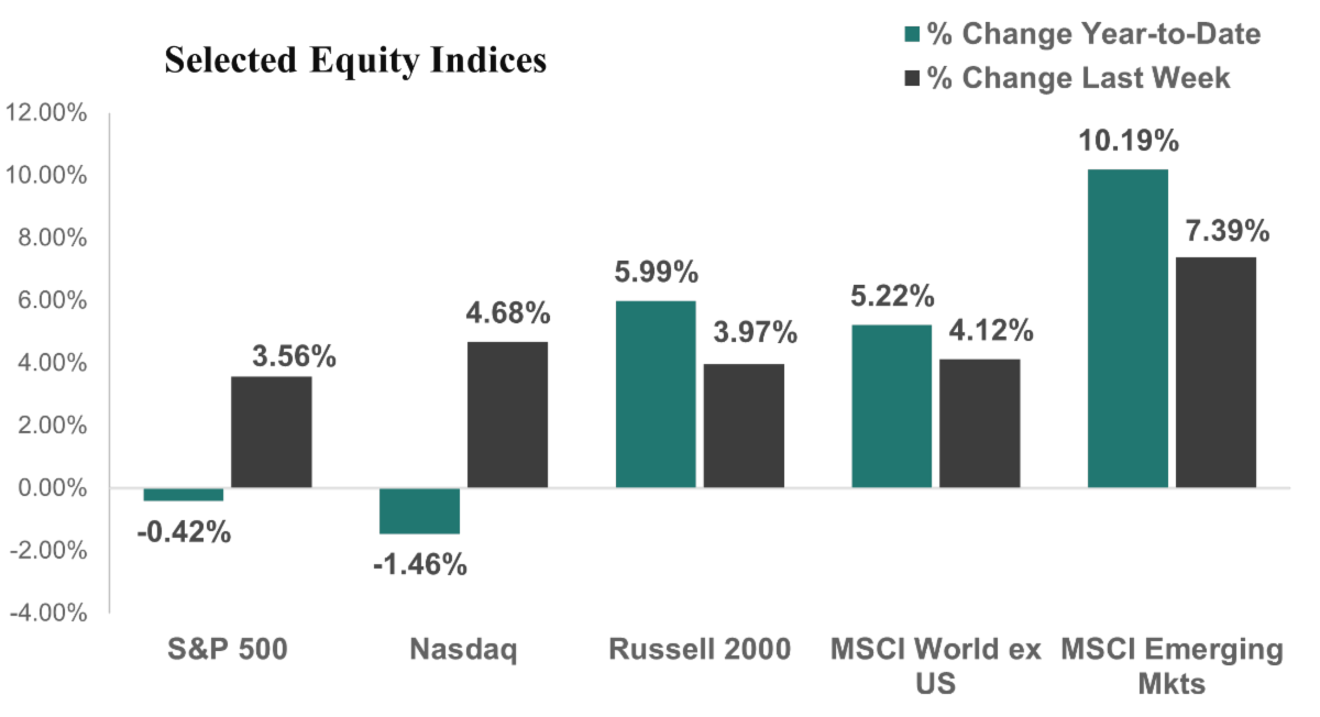 Global Equity Markets surged as well last week on growing expectations for a resolution in the Middle East. Developed Markets rose 4.1% for the week and are now up 5.2% for the year. Emerging Markets rallied 7.2% for the week to bring its gains for the year to 10.2%.