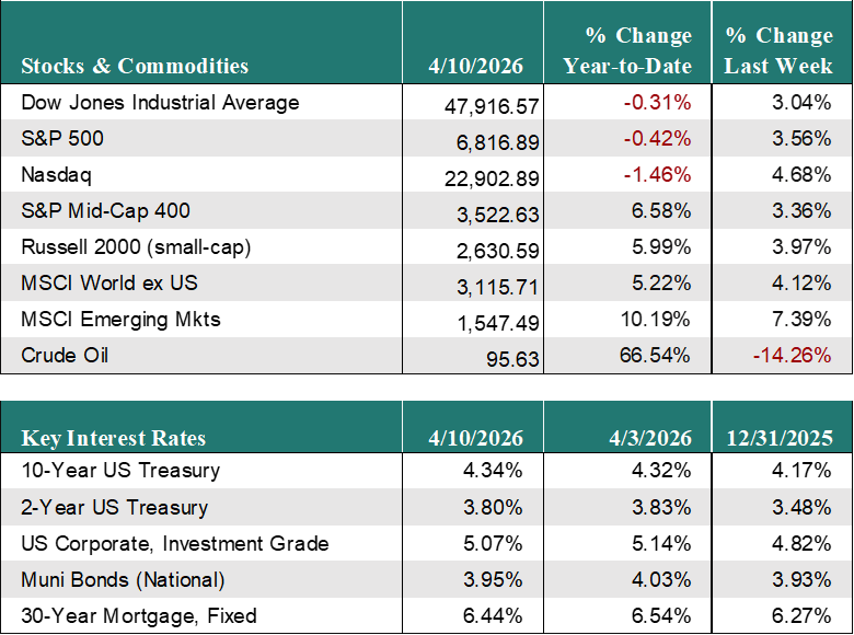 US Equity Markets rallied last week as the US and Iran entered a two-week ceasefire, bolstering investor hopes for some type of resolution. The S&P 500 rose 3.6% for the week and is now only down 0.4% for the year. The Nasdaq increased 4.7% for the week to bring its losses for the year to down 1.5%, while the Russell 2000 (small cap stocks) surged 4.0% for the week and is now up 6.0% for the year.