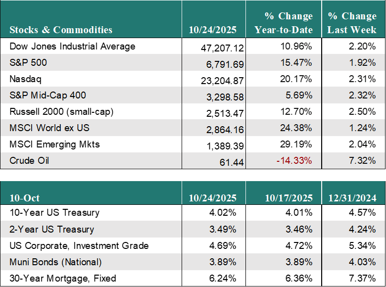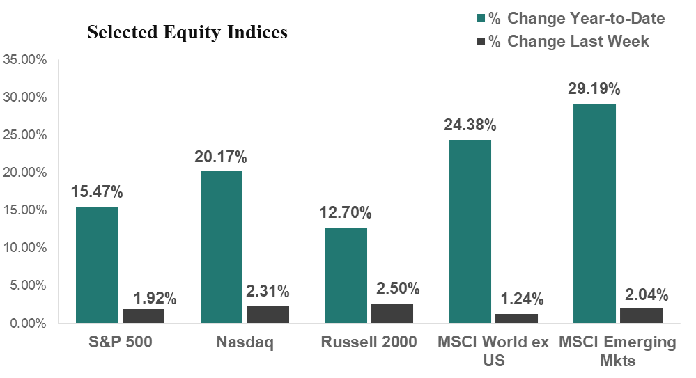 US Equity Markets pushed higher last week, as favorable inflation data reinforced expectations for a Fed rate cut at its meeting this week. The S&P 500 rose 1.9% for the week and is now up 15.5% for the year. The Nasdaq was up 2.3% for the week to bring its gains for the year to 20.2%, while the Russell 2000 (small cap stocks) increased 2.5% for the week and is now up 12.7% for the year.