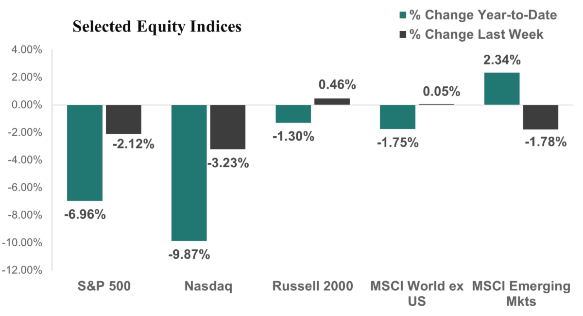 US Equity Markets declined again last week as oil prices hit their highest weekly close since 2022, though under the surface, the markets were better, highlighting ongoing investor rotation. The S&P 500 dropped 2.1% for the week and is now down 7.0% for the year. The S&P 500 Equal Weight Index was down 1.1% for the week and has outperformed so far this year, only down 1.6%. The Nasdaq fell 3.2% for the week amid a sharp sell-off in technology stocks to bring its losses for the year to down 9.9%, while the Russell 2000 (small cap stocks) rose 0.5% for the week and is now down 1.3% for the year.