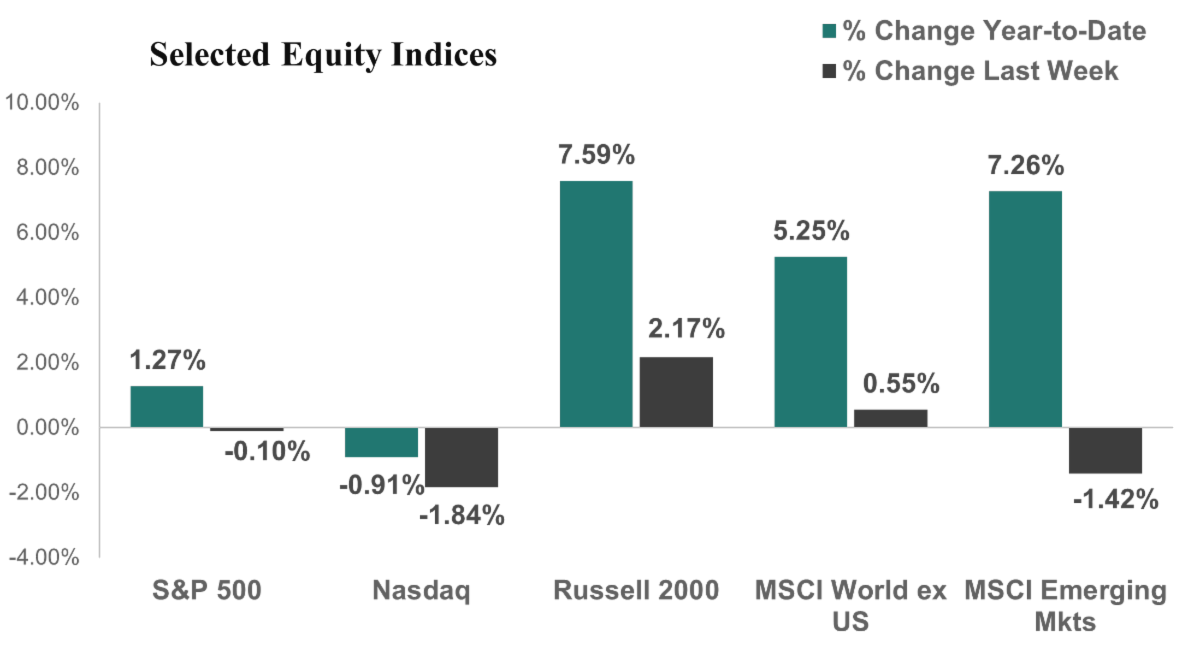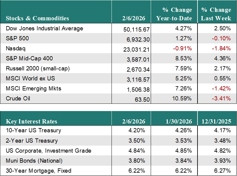 US Equity Markets experienced significant volatility last week but ended with only a mild decline,as fears that AI would disrupt software firms resulted in heavy selling within Technology. After being down sharply, the S&P 500 only closed down 0.1% for the week and is now up 1.3% for the year. The Nasdaq tumbled 1.8% for the week, erasing its gains for the year, now down 0.9% for the year, while the Russell 2000 (small cap stocks) continued to outperform, up 2.2% for the week and now up 7.6% for the year.