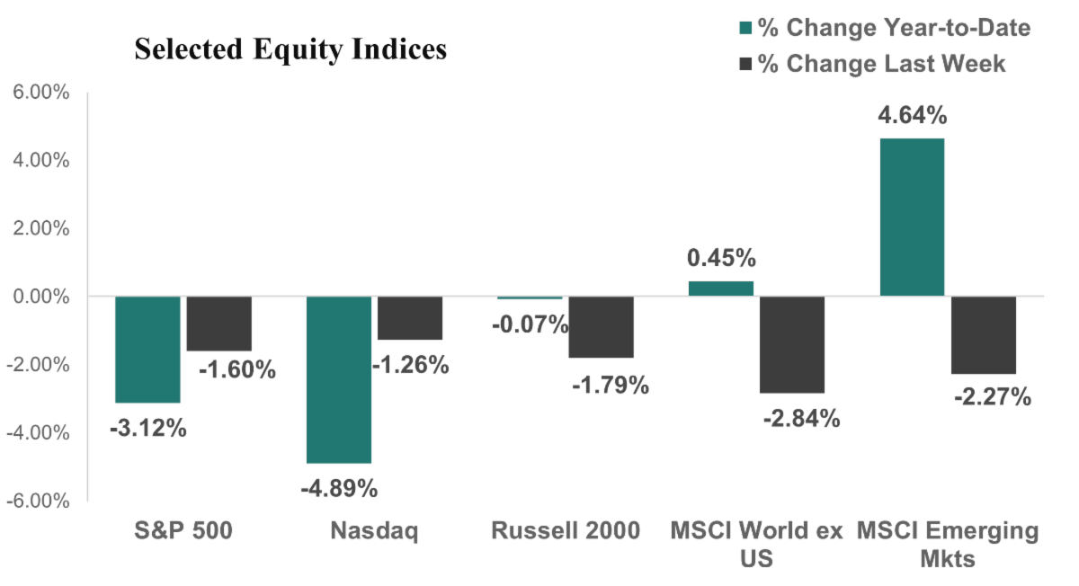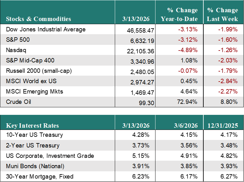 US Equity Markets continued their recent declines, as worries around rising oil prices and the escalating conflict with Iran weigh on investors. The S&P 500 declined 1.6% for the week and is now down 3.1% for the year. The Nasdaq fell 1.3% for the week to bring its losses for the year to down 4.9%, while the Russell 2000 (small cap stocks) dropped 1.8% for the week, erasing its gains for the year, now down 0.1% for the year.