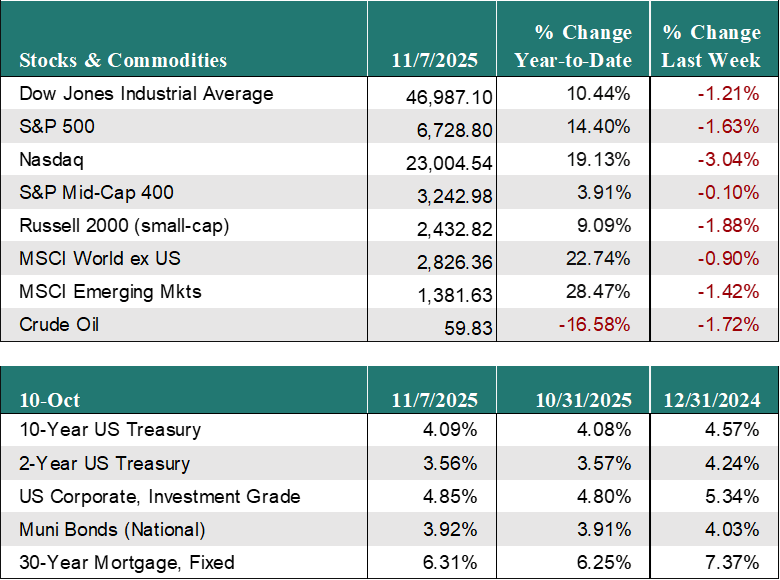 US Equity Markets dropped notably last week amid concerns about AI-related valuations and weakening consumer sentiment, leading to profit-taking particularly across the technology sector. The S&P 500 dropped 1.6% for the week and is now up 14.4% for the year. The Nasdaq tumbled 3.0% for the week given declines in technology stocks to bring its gains for the year to 19.1%, while the Russell 2000 (small cap stocks) fell 1.9% for the week and is now up 9.1% for the year.