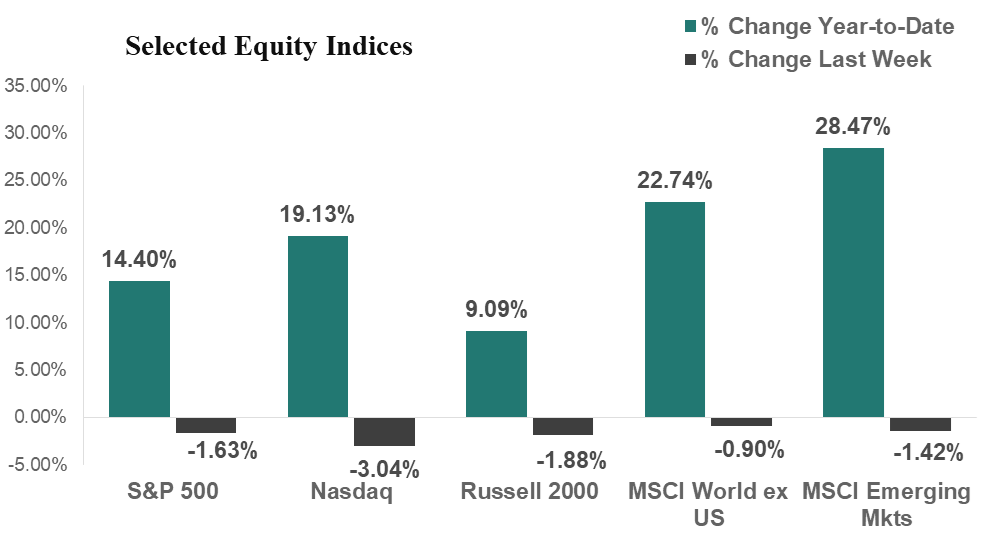 Global Equity Markets declined as well last week, also caught up in profit-taking across technology. Developed Markets were down 0.9% for the week and are now up 22.7% for the year. Emerging Markets fell 1.4% for the week to bring its gains for the year to 28.5%.