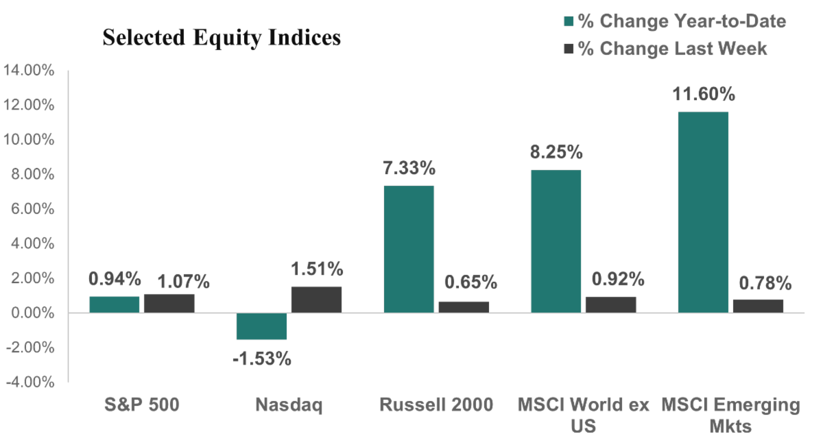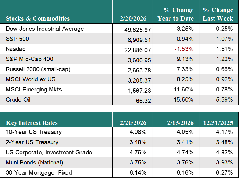 US Equity Markets rose last week despite the rising probability of an attack in Iran and uncertainty tied to the Supreme Court's overturning some of President Trump's tariff orders. The S&P 500 was up 1.1% for the week and is now up 0.9% for the year. The Nasdaq increased 1.5% for the week but remains down 1.5% for the year, while the Russell 2000 (small cap stocks) rose 0.7% for the week and now up 7.3% for the year.