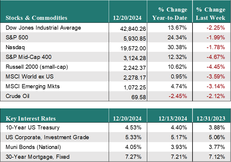 • US interest rates rose last week despite a Fed rate cut. As expected, the Fed lowered the Fed funds rate by 0.25% at its meeting last week, but they reduced their expectations for rate cuts in 2025 from 4 times to 2 times, citing healthy economic growth and sticky inflation. As a result, the yield on the US 10-Year Treasury increased to 4.52% from 4.40% the prior week, its highest level since May 2024.