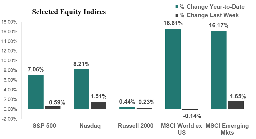 US Equity Markets posted healthy gains last week, once again touching new highs as the first week of corporate earnings reports came in better than expected. The S&P 500 rose 0.6% for the week and is now up 7.1% for the year. The Nasdaq was up 1.5% for the week to bring its gains for the year to 8.2%, while the Russell 2000 (small cap stocks) increased 0.2% for the week and is now up 0.4% for the year.