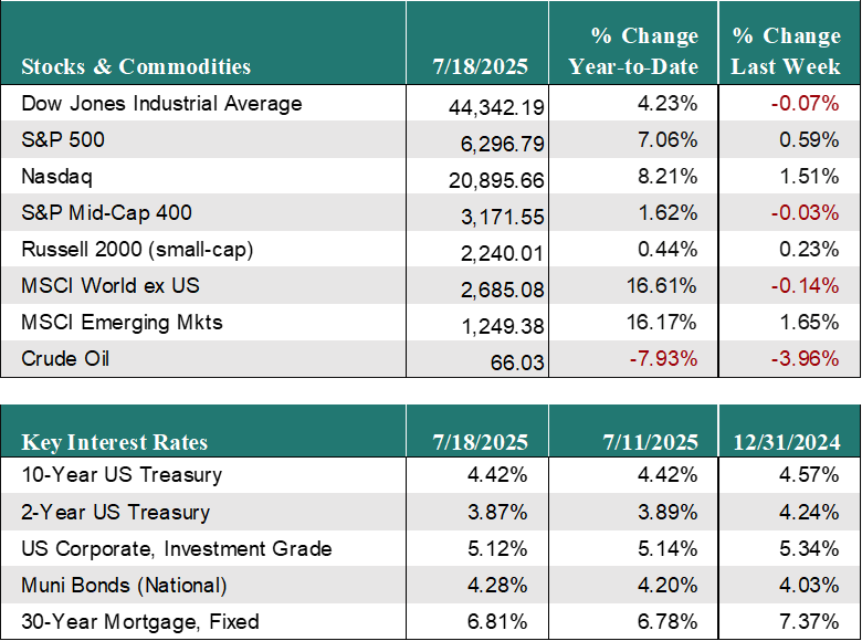 Inflation rates increased in June but remain largely in check. With investors watching for potential price increases due to tariffs, inflation has come in better than feared thus far. The Consumer Price Index (CPI) for June increased 2.7% from a year ago, in line with forecasts but up from 2.4% in May. Core CPI, which excludes food and energy prices, rose 2.9% in June from a year ago, slightly better than forecasts and up from 2.8% in May.