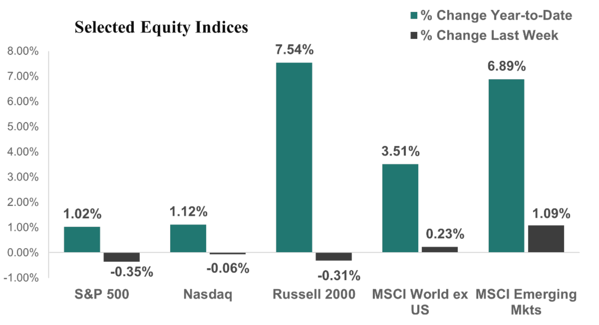 US Equity Markets dropped last week as geopolitical tensions around Greenland and potential new tariffs lingered. The S&P 500 fell 0.4% for the week and is now up 1.0% for the year. The Nasdaq was down 0.1% for the week to bring its gains for the year to 1.1%, while the Russell 2000 (small cap stocks) declined 0.3% for the week and is now up 7.5% for the year.