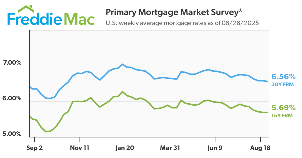 According to Freddie Mac's Primary Mortgage Market Survey, the 30-year fixed mortgage rate (30Y FRM) dropped from June to 6.56% as of the week ending July 24.
