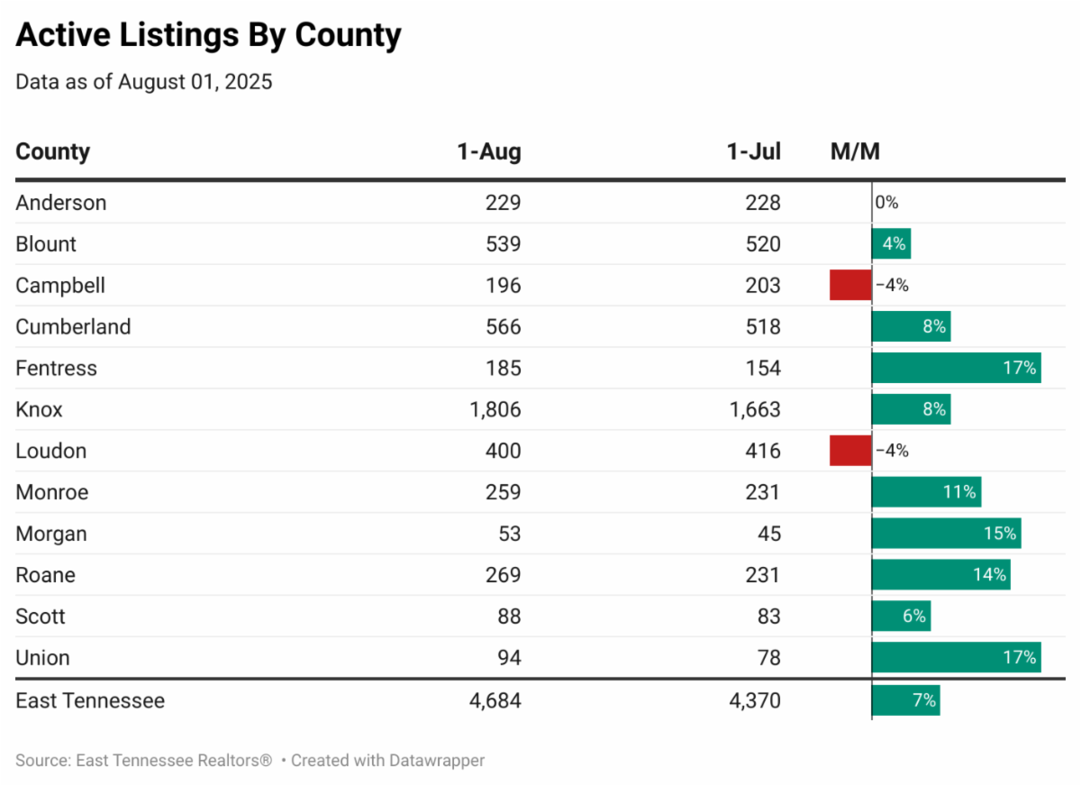 Out of the 12 counties in the East Tennessee REALTORS® footprint, 9 marked measurable increases in active listings over the month of July. Overall, regional inventory increased month-over-month by 7%.