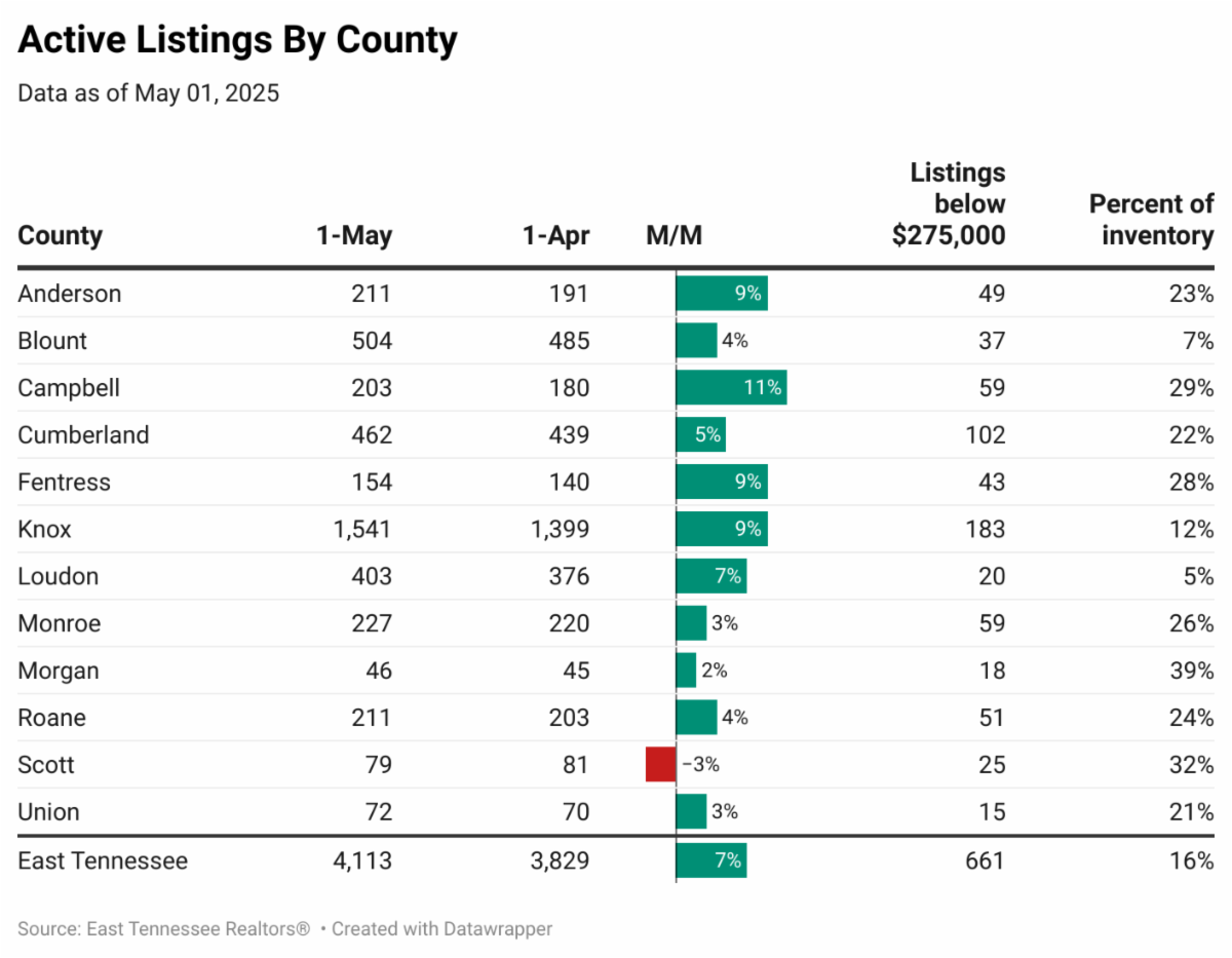 The below study used one month's worth of active listings from March 2025 to get a more accurate snapshot of demand in the Knoxville metro area, which includes Anderson, Blount, Campbell, Grainger, Knox, Loudon, Morgan, Roane and Union counties.
