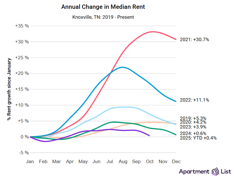 In the greater Knoxville area, median rent for a 2-bedroom apartment has dropped slightly to $1,142 from a high earlier in the year of $1,206. Median rent for a 1-bedroom apartment is $905.